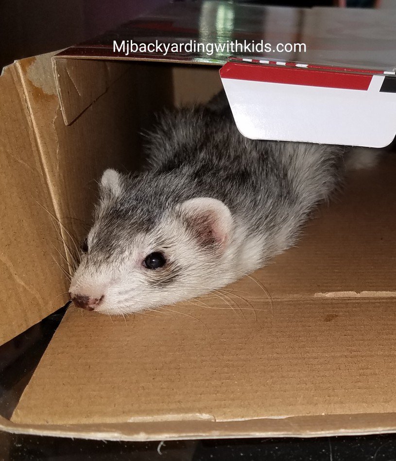 Today after school I cleaned out the ferrets. The older kids like to watch them run around but the two younger ones like to throw their toys and have the ferrets ( their small toy balls and tug ropes) fetch them. The ferrets run after the toys but never bring them back. So in reality the ferrets have the two younger children trained. They go and get the toy and then throw it again😂😂. Today after I was done cleaning their cage out I went to look for them. Ghost is easy to find you just follow the water trail. He likes to go swimming in the dogs water dish😂😂. I however couldn’t find cashew she wasn’t in her normal places that she hides in. After getting everyone on deck to find cashew my second oldest finally found her, lol she was playing inside a box that I hadn’t gotten a chance to take out yet.