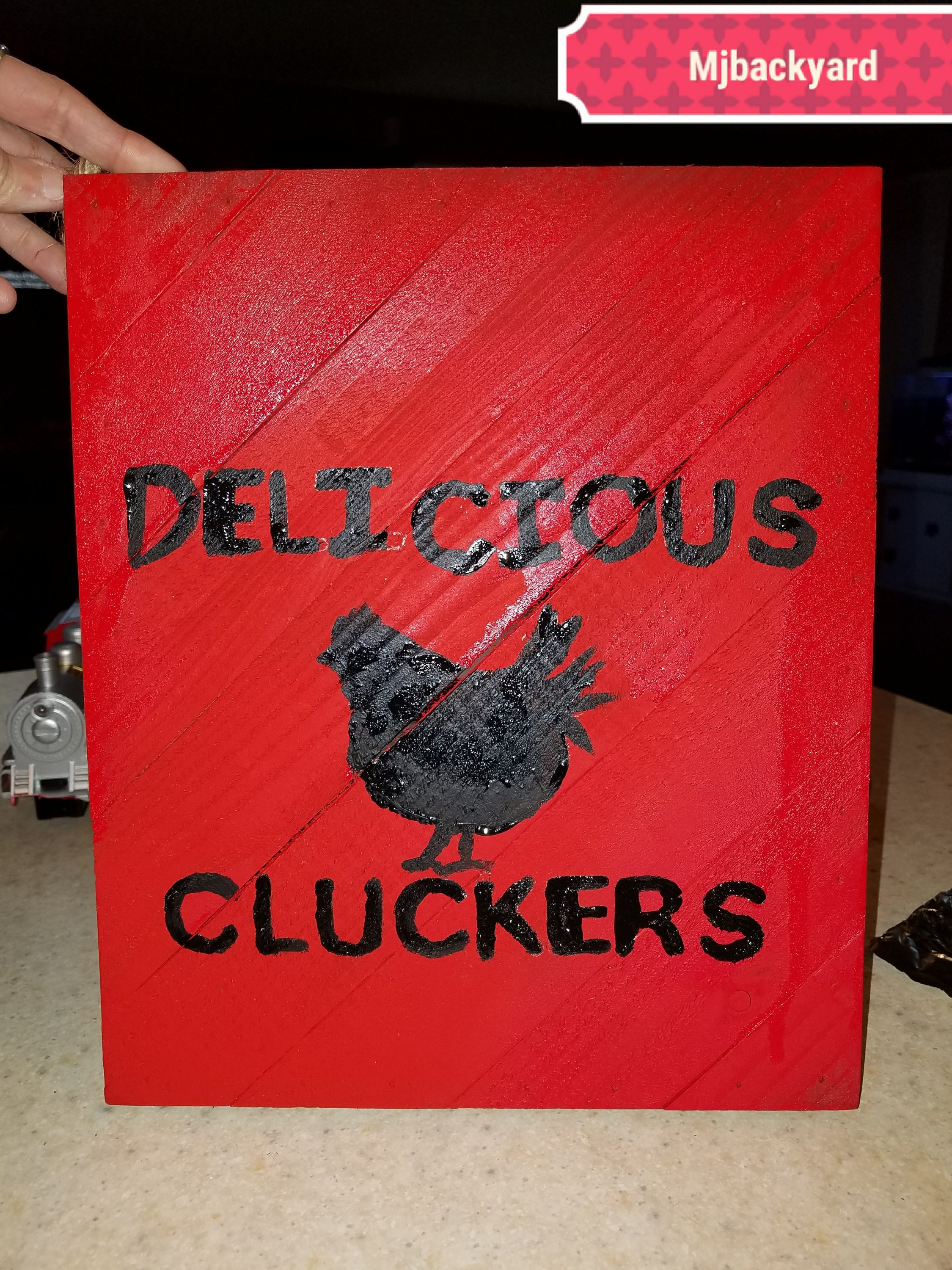I finally fell in love with ” delicious cluckers” no I as of right now do now have any meat birds but some day I would like too. I found this name to be funny. I’m not the best at painting letters but I do love how my chicken turned out! #funnyname #chickens #farmlife #lovemycoopname